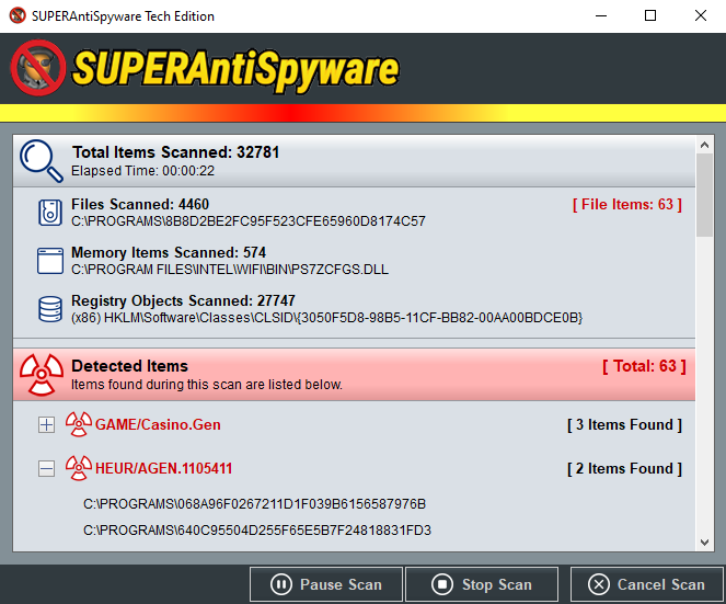 The scanner shows detailed information about malicious items detected on a PC as the scan progresses