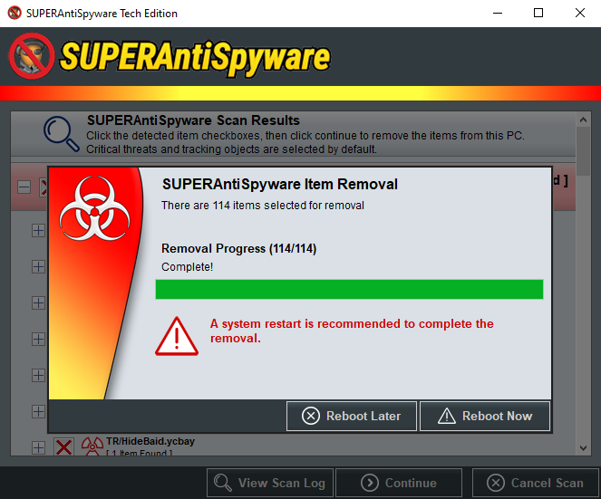 SUPERAntiSpyware may recommened rebooting a PC to ensure complete removal of malware
